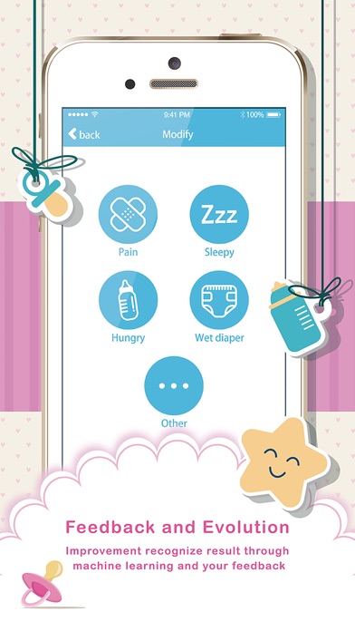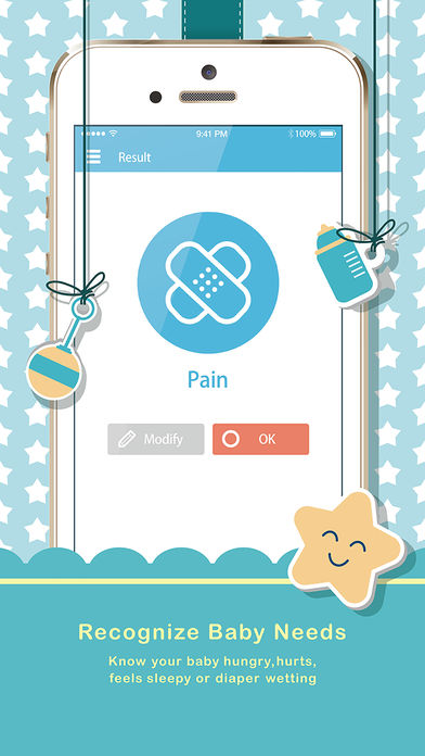 1. Baby Cries Translator is the first commercial APP has the ability to learn and identify the needs and cries of infants within six months old, including hunger, sleepiness, pain, and wet diapers, which can help novice parents understand why babies cry. 2. We cooperated with a pediatrician at the National Taiwan University Hospital Yunlin Branch, Taiwan for the identification technology. 3. Press the record button for fifteen seconds, then the cries will be uploaded and identified automatically. The identified result will be displayed on the screen. 4. The clinical recognition accuracy of this product is up to 92%, 85.4%, 83.8%, and 77% for infants born within 2 weeks, 1 month, 2 months, and 4 months, respectively. 5. This app is suitable for infants of all nationalities, races, and genders. 6. This app provides error correction mechanism, so you can make a personalized model of your babies’ cries to increase the recognition rate. 7. Please record the cries in a quiet environment, so as not to affect the recognition rate. 8. The identification result is only for reference, if the baby continues to cry after tending to him/her, medical treatment is advised.
