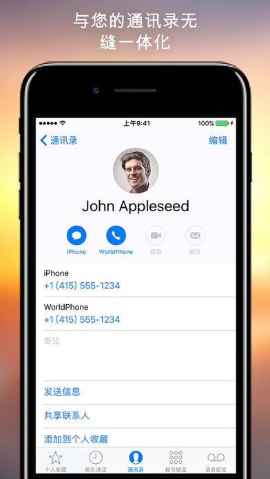 World Phone能够实现最清晰、最可靠的语音通话。以最优惠的价格进行最优质的全球呼叫和接听。 ** 特别优惠:现在就试试World Phone,用我们最新的应用程序至应用程序通话功能免费呼叫家人、朋友和同事。 ** 主要特点: 清晰可靠的语音通话 - World Phone会通过优质电话网路智能地为您选择语音通话线路,尽可能为您提供最可靠、最清晰的通话。 简捷的联系人 - 无需为独立的联系人列表而困扰。World Phone简捷地无缝集成您的iPhone现有联系人!您甚至能从手机的联系人列表进行World Phone通话。 Be Local - 毫不费力地租用应用内本地电话号码,用于旅行或与外地联系人和/或亲属通话。可提供70多个国家的号码! 与iOS 10完全兼容 - 无需再进行二等公民VOIP通话 - World Phone现在支持全屏来电通知、呼叫等待、呼叫保持、最近通话整合等。 World Phone现在更加完善了 - 马上尝试!