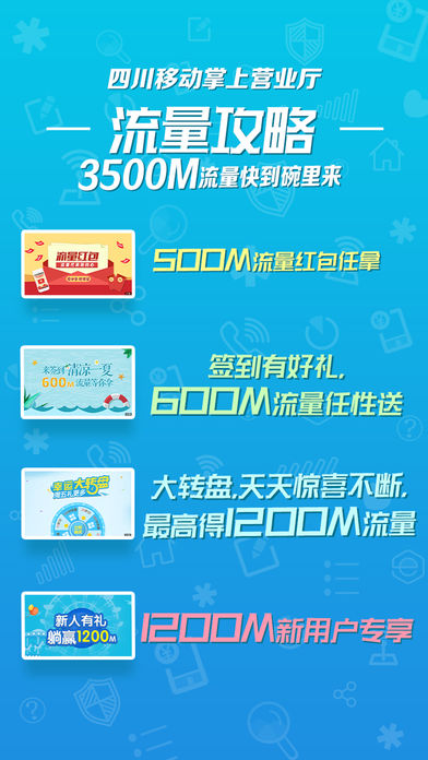 四川移动掌上营业厅是中国移动四川有限公司(官方)推出的自助服务客户端软件。面向四川移动智能终端用户,提供账单查询、话费充值、流量管理、积分兑换、业务办理,在线客服等功能,随时享受移动优惠信息和特色服务。 优惠活动: 【爱分享,抢流量-每月必玩】500M+500M=1000M流量,免费抽500M流量红包,风云榜还可抽500M流量,羊毛可薅两次! 【群红包】一波新操作,每周二抽流量群红包,你发红包,掌厅买单,不能更划算~ 【有奖签到日历】“签”走600M流量,每日签到,越勤奋越幸运,精彩活动随时掌握。 【大转盘-流量,话费拼手气】是不是周五抽到300M流量时内心就稳了,积分也要天天抽,一言不和就中奖! 【新人有礼-有点带劲】新用户登录掌厅,就有机会得1200M流量! 服务: 【流量专区】 7*24小时全天候流量管家,官方权威流量统计。流量不够用?使用流量加油包、叠加包、省心包,让你的流量飞起来! 更有新增视频流量包,季度/半年包,地铁流量,国际流量,更对味! 【话费充值】 实时快速话费充值和优惠折扣,支持“支付宝”、“微信”、“和包”(和包支付享专属优惠)安全支付! 【业务办理】 轻松办理4G套餐、流量包、积分兑换,生活娱乐等业务,助您精打细算、畅享移动体验! 【优惠活动】 新人有礼,爱分享,群红包,签到抽奖,流量话费赢到手软! 【套餐余量】 套餐余量使用情况一目了然,数据流量、语音使用详情清晰可见! 【已订业务】 已订业务快速查询,订购时间、生效时间、失效时间,再也不迷糊; 【宽带预约】 移动宽带,让网速飞起来,四川移动优惠宽带套餐预约办理,尽在掌上营业厅! 【账单查询】 各月账单明细一目了然,轻轻松松查询、明明白白消费! 【积分兑换】 电子券、话费、流量、快速安检,猛戳“积分兑换”! ==========联系方式========== 四川移动掌上营业厅,你身边的营业厅! 如果有任何的问题,请联系我们! 官方微博:@四川移动掌上营业厅 官方QQ群:掌厅会员俱乐部(564420987); 期待您的加入!