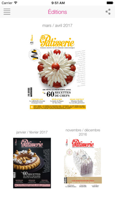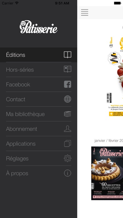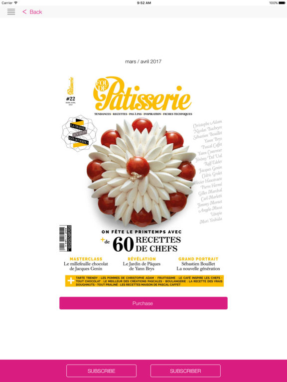 L'application Fou de Pâtisserie vous propose une version numérique enrichie de l'édition papier du magazine Fou de Pâtisserie. Fou de Pâtisserie est le premier magazine entièrement dédié à la Pâtisserie. Fou de Pâtisserie sur votre tablette ou smartphone : une nouvelle expérience de lecture avec des interactivités (sommaire dynamique, liens internet...) et des bonus exclusifs (vidéos, diaporamas photos, extraits sonores...) ! ATTENTION : L'appli Fou de Pâtisserie est accessible depuis l'icône « Kiosque » de votre appareil et pas sur l'écran d'accueil de votre iPad ou de votre iPhone ! Acceptez de recevoir les notifications push pour être informé des exclus, des infos et de l'arrivée de la nouvelle parution de Fou de Pâtisserie. Achat à la parution : 4,99 € Abonnement 1 an : 29.99 € Une fois téléchargées, les éditions restent accessibles partout, même hors connexion. Voici les caractéristiques des abonnements Apple : - Votre paiement sera prélevé sur votre compte iTunes après votre confirmation d'achat. - Votre abonnement sera renouvelé automatiquement, à moins que vous ne désactiviez la fonction renouvellement automatique au plus tard 24h avant la fin de votre abonnement. - Le cas échéant, votre compte sera débité au titre du renouvellement 24h avant la fin de l'abonnement. - Après votre achat, vous pouvez désactivez l'option de renouvellement automatique dans l'espace Votre compte d'iTunes. - Il n'est possible d'annuler un abonnement pendant sa période de validité. Notre politique de confidentialité et CGU sont disponibles à cette adresse: http://dbci.fr/presstalis_dp/cgu/conditions_generales_confidentialite.php