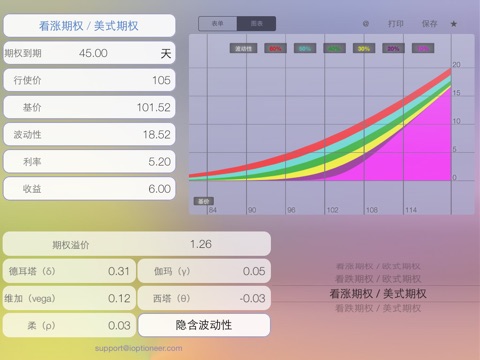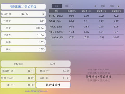 期权助手(Options) - 一款欧式期权和美式期权的全新计算器。该应用专门为期权高效定价而开发。它可简单快速地计算各种类型看涨期权和看跌期权的期权溢价和风险参数。 特点: - 欧式期权和美式期权估值 - 计算风险参数:德耳塔(δ)、维加(vega)、西塔(θ)、伽玛(γ)等 - 包括隐含波动性计算模式 - 构建期权的压力表单和压力图表 - 发送详情计算和结算表到您的电子邮箱或打印机 - 即时保存计算结果。支持收藏 本应用提供21种语言。