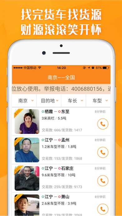 应用简介:快速发货简单方便,百万司机一秒响应。运满满是国内首家基于移动互联网技术开发的0费用手机物流配货平台。拥有国内百万卡车司机与有货货源,是一款用于运输物流、寻找一手货源信息、发布物流车源信息的软件,货运界的“滴滴”。为车找货(配货)、为货找车(托运)提供全面的物流信息服务,为百万货主提供经验丰富,靠谱安全的货运司机! 【功能亮点】 1、海量覆盖 我们拥有百万司机、让货主配货无忧! 2、省时!省力!省心! 运满满货主版让您随时随地发布国内货源货运信息,并及时配置车源。为货主找货车,为货车配货源! 3、精准定位 精准定位货物运输路线,时刻掌握司机运输实况! 4、发货得积分,积分换好礼 发货找货积分多,积分好礼换不停! 5、提高配货找车效率 货源车源消息多,配货找货不用愁,降低回头车、回程车、返程车的空返率,改善整体物流配货找车效率。 运满满物流配货找车手机APP,祝您生意腾飞! 客服电话:400-688-0156