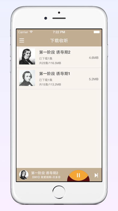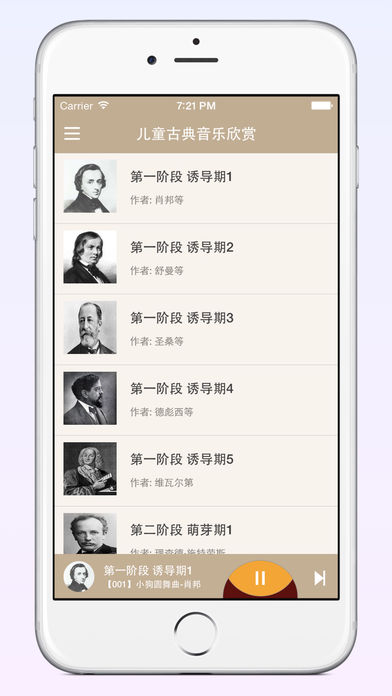 【儿童古典音乐欣赏】 让孩子学会聆听“真正的音乐”,让孩子从小和“美”无限靠近~ 这是一个为孩子量身定做的音乐学习与能力训练的专业应用,以故事解读的方式专业提升孩子的音乐欣赏能力,用音乐欣赏作为训练素材,专业提升孩子的注意力、记忆力、语言表达能力与想象创造力。 每晚临睡前让孩子听20 分钟左右曲目,中间尽量不要间断,坚持下去,你会发现孩子有惊人的提升~ 古典名曲再也不是曲高和寡难以亲近,世界上最优美的古典音乐小品、奏鸣曲、交响乐及歌剧等作品,藉由音乐故事和亲子游戏、亲子活动、训练,循序渐进引领孩子们走进优雅浩瀚的音乐世界~ 下面是该应用的一些功能特点: 1.在线断点续听。在没有WIFI时在线收听音乐,也是非常之流畅; 2. 省流量。应用做了非常优秀的优化改进,使得在线收听非常省流量,即使没有WIFI的环境下,再也不担心流量问题,随便听。 3. 离线收听。可以在有WIFI的环境下先下载再收听,在没有网络或者网络不好时,也可以方便的给孩子听古典音乐。 还在犹豫什么?赶紧下载应用,让孩子开始聆听“真正的音乐”吧~