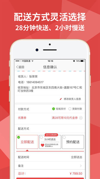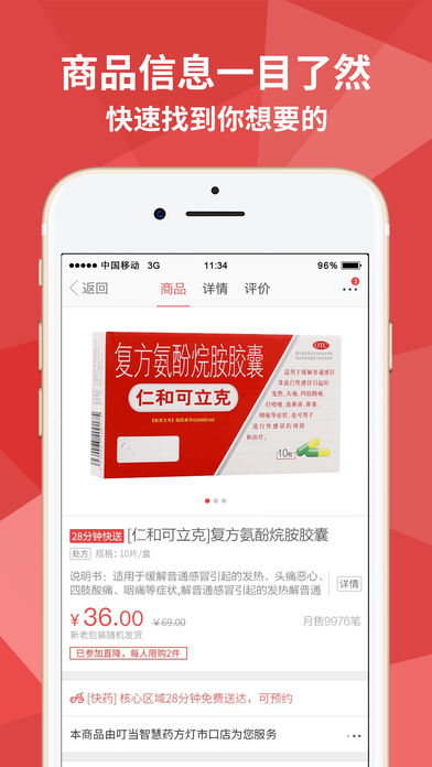 新人特权:注册即送100元优惠券; 疗程购:专业!省钱!专业医师科普视频,品牌组包产品超低折扣 专业服务:28分钟快速送到家,专业药师7*24小时用药指导服务! 【配送范围】 叮当快药服务全国用药百姓,其中,北京、上海、广州、深圳、成都、郑州六大城市率先开通28分钟送药家服务。 【产品介绍】 独自在陌生城市打拼的你,生病了还强撑工作; 老公不在身边的你,宝宝突然生病,束手无策; 挂念远方父母的你,担心他们的常用药是否充裕; 半夜高烧不退的你,还在风雪中找寻24小时药房。 叮当快药,在您身边,一键解决用药难题。 【快速】核心区域内28分钟送达! 【专业】专业药师7*24小时用药指导服务! 【便捷】一站式到家服务! 【周到】恒温、恒湿箱保证药品安全! 叮当快药是一款基于O2O的医药健康类互联网产品,是协助药店提供便民服务需求的第三方信息展示平台。致力于打造信息、产品、服务三维一体的移动医疗生态圈,为消费者提供更加便捷的购药服务体验,用心服务人类健康事业。
