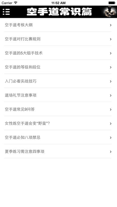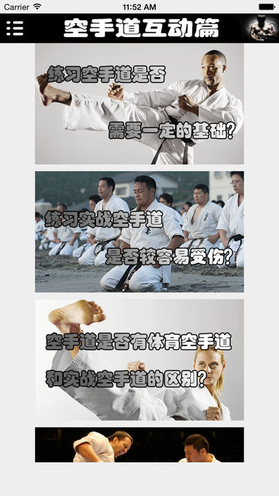 App Store中最据权威的空手道宝典。让你可以在短时间内从菜鸟到高手的必备神器。 速成:只要你对武术有一点点兴趣,打开宝典看一看,分分钟让你成为武术界中的“战神”! 易学:我不是一本枯燥的空手道教科书,用文字来阻碍你的行动,我是一个简简单单按照视频步骤动起来,就一定能够成功的宝典式App! 随时随地:利用你的任何时间,上班公交车,下班挤地铁,什么时候想看了拿出来看看,下次实战的时候照样做一做,你的朋友或队友就会明显感觉到你的水平在提升。 本App中将把手为您演示,让您深度了解空手道的各种炫酷技巧。