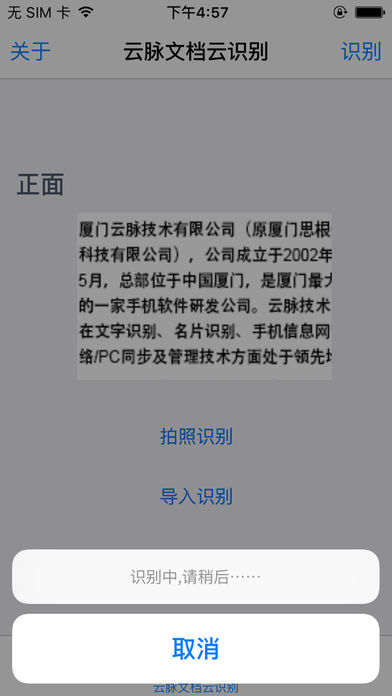 产品描述 云脉文档云识别应用软件是云脉科技公司提供的光学字符识别技术(OCR)演示软件,手机端提交要识别的内容,云端服务器执行识别任务,并迅速返回识别结果。用户可以用这个手机应用软件体验云脉光学识别技术在文档识别中的应用。 功能特点 - 支持用手机直接拍摄提交识别对象; - 支持导入手机相册中的图片提交识别对象; - 云端服务器执行识别任务,识别速度快; - 界面简单,操作便捷。 识别语言 中文(简/繁体)、英文、德语、丹麦语、法语、意大利语、西班牙语、葡萄牙语、瑞典语、芬兰语、挪威语、荷兰语。 设备要求 支持iPhone 4及以上的设备/iOS 6.0及以上的操作系统。