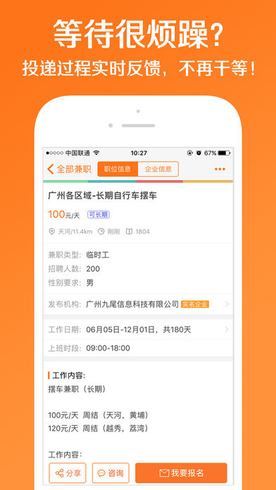 应用介绍: 兼职,是一种新的职业生活方式! 兼职猫,一款真实可靠的找兼职平台,多元化的赚钱方式将丰富着你的生活! 想兼职,没保障,兼职猫六个措施全面保障用户权益。 排队,等人,时间太零碎,玩转喵任务,时间可变现。 无聊,迷茫,缺乏职业规划,来A猫学堂,学习原来如此有趣。 世界那么大,钱包那么小,选兼职旅行,邂逅美好青春 【让钱包鼓起来-短期兼职】 购物要分期,教育要贷款 兼职一样可以让钱包鼓起来 学习强当家教,颜值高可以当模特 总有一款兼职适合你。 【这里N多签约名企-精岗专享】 大三找实习,应届生求职找工作 想进大型企业,不了解招聘要求 万家名企直签,求职更有保障 【应用试客可赚钱-喵任务】 想赚钱,却没时间 你只需要一个手机 体验几款应用,或填写一下问卷 赏金立马到账,支持提现。 【跟谁学-A猫学堂】 学习太无聊,未来太迷茫 学习能手,职场巨擘与你面对面 职场教育,0距离沟通 规划属于自己的未来。 更多功能请打开兼职猫 海量兼职,限时提价 优惠福利,任君挑选 兼职猫已拥有千万级别的忠实用户,我们希望打造一个全民兼职的时代!快快加入我们吧,一起来创造一个“斜杠青年”的时代吧! — 联系和反馈 — 对于产品如有任何疑问和建议,请联系我们 客服QQ:800005602 客服电话:4008034199 官网:http://www.jianzhimao.com