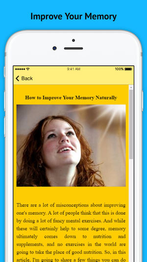 Improve Your Memory is a app that includes some very helpful Information for How Do You Improve Your Memory by Changing Your Behaviour!! Improve Your Memory includes How Do You Improve Your Memory Use an Improve Your Memory Quiz How to Fight the Signs of Aging How to Improve Your Memory for…