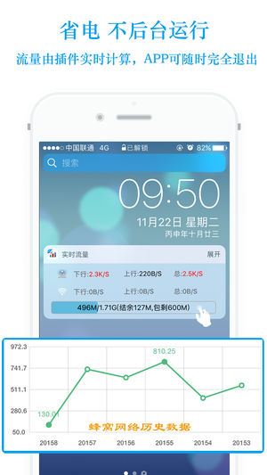 符合中国国情的流量监控插件来了! √ 流量套餐、流量上月结余、套餐外流量包,一个不能少! √ 流量插件不后台运行,除了省电还是省电! √ 你是否觉的打开关闭系统“移动蜂窝网络”比较繁琐? 可以在Widget插件中,点击蜂窝4G网络或者Wifi网络区域试一下O(∩_∩)O~ √ 你是否觉的手机营业厅流量数据跑的太快? Widget流量插件依据手机端实际使用数据,实时计算当前流量,无延迟,可以与移动/联通/电信手机营业厅流量数据轻松比对,防止流量被偷。 还有: √ 在widget中: 1. 查看实时的移动蜂窝网络(2G/3G/4G/Edge/GPRS)和WIFI的上行、下行、总量信息。 2.…