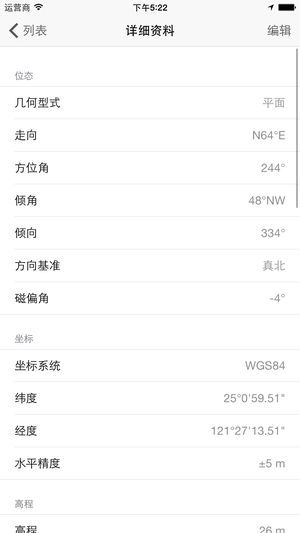 本程式主要用于量测地质构造之位态,具有以下特点: 1) 可记录现地之地层走向、倾角、倾向、方位角、座标、高程及地点。 2) 亦可量测线构造。 3) 可选择以真北或磁北作为方向基准。 4) 调查成果同时以地图及列表方式展示。 5) 调查数据可汇出为csv档,以作为后处理使用。 6) 此外,使用者亦可针对量测数据添加照片、影片、语音备忘或文字描述,以增加量测数据之辨识性。所有照片、影片及语音备忘档案均可透过iTunes下载至个人电脑。