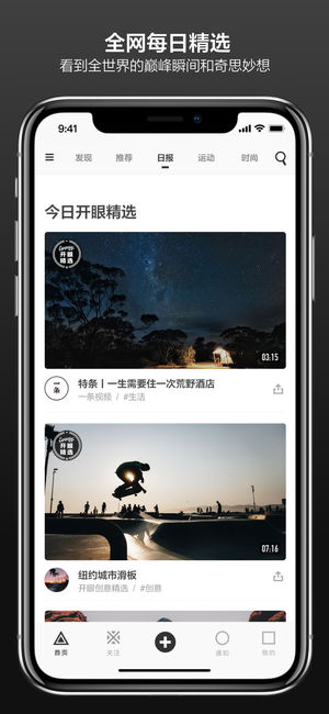 开眼 Eyepetizer 4.0 全新版本,发现潮流文化,分享美好瞬间 --------------------- 开眼 Eyepetizer 是一个汇聚国内外青年潮流文化的短视频与图片内容社区。包括新鲜出炉的创意视觉作品和好玩有趣的潮流青年。开眼,看世界! 「每日精选推荐」 每日人工精选出有趣高清短视频和社区用户图片视频创作,看到这个世界此时此刻精彩的瞬间记录和奇思妙想的创意内容。 「分享美好瞬间」 人人都是创作者,无论是摄影创作、旅行记录、生活集锦、美食探店,向世界展示你眼中理想的生活 「发现潮流文化」 寻找运动、美食、游戏、旅行、创意等各个领域的新鲜达人和创作,发现志同道合的朋…