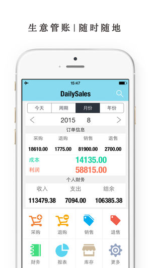 DailySales 简单实用,把生意搬到手机上来管理,销售记账,日常记账,进出货管理,打理生意,正是您需要的。一边管理一边销售,统计分析,轻松打理您的旺铺。随时随地为您提供货物统计,管理进货退货、销售退售、库存统计。 为生意人定制,适用所有实体店: 首创,实物商品、服务项目都能管理。他们都在用: 美发美甲屋,咖啡馆,宠物店,淘宝店,微店,餐厅,茶馆,花店,影楼,甜品店,文具店,五金店,杂货店,玩具店...... 简单,细致,到每笔销售与进货: 无论身在何处做生意,掏出手机立马开始管理,甚至每笔销售、每位供应商。帮助大家把生意看得更清楚,其实并不复杂;抛开繁琐,立即找到您想要的,前所未有的…
