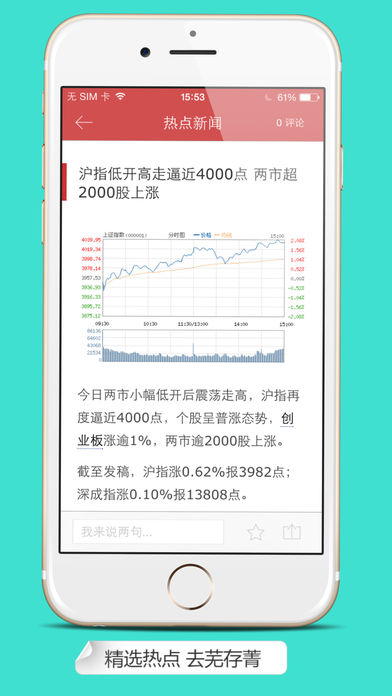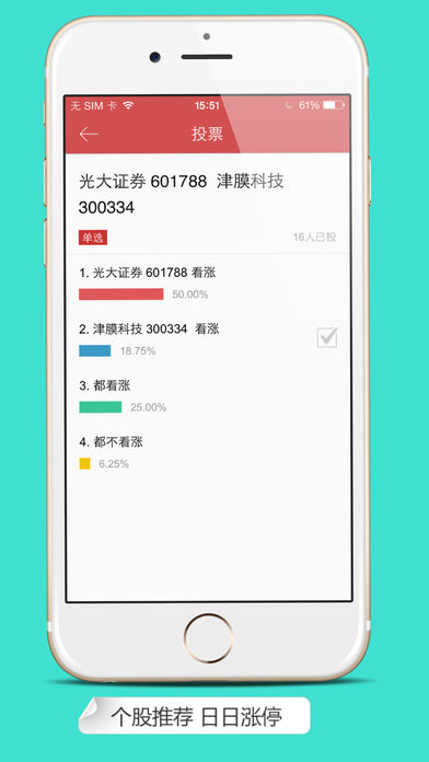 手机炒股票神器! 独创的分析模型,挖掘出最牛股票 实时分析全网舆论信息,统计涨跌观点 即时推送提示,不再错过每一笔交易! 每日股票推荐,7交易日涨跌,能者把握!