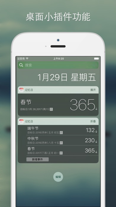 “记忆日”这个应用软件是提醒你每天重要的日程安排和事情。 这是AppStore里最好的倒计时程序,提供优化iOS10,与模糊效应,矢量图像和各种功能。 基本功能: 1. 事件分类 2. 事件分享 3. 自定义分类 4. 自定义提醒 5. 主要日常活动通知 6. 日期的自定义设置 7. 自定义事件重复周期 8. 为主要事件的修补图标倒计时 特色功能: 1. 阴历设置 2. 日期计算器 (在主画面往左边滑动) 3. 自定义主题 4. iCloud备份 5. 支持3D解锁 6. 过去事件通知 7. 用作桌面插件 8. 支持插件主题 9. 支持3D touch 10. 锁定屏幕保护 11. 背景图片自定义 12. 修补图标倒计时 13. 日历事件读取与推送 14. 通过目标用了一天功能 15. 可变的日期格式 (300 or 9个月 25日)