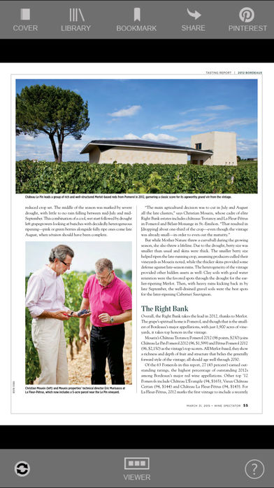 Don't make another wine-buying decision without it! Wine Spectator magazine rates over 15,000 wines per year, in every price range, to fit every occasion. Read about the world's great wineries and winemakers and visit restaurants with outstanding wine lists. Plus, each issue features delicious recipes and pairs them with the perfect wines. Purchase options: Editions of Wine Spectator Magazine are available for purchase as single issues or via an auto-renewable subscription as follows: - Yearly subscription for $49.99 (15 issues) - Single copy issues for $5.99 - Payment will be charged to your iTunes account - Account will be charged for $49.99 renewal within 24-hours prior to the end of the current period - Subscriptions may be managed by the user and auto-renewal may be turned off by going to the user's Account Settings after purchase - No cancellation of the current subscription is allowed during active subscription period - Any unused portion of a free trial period, if offered, will be forfeited when the user purchases a subscription