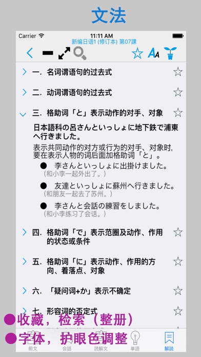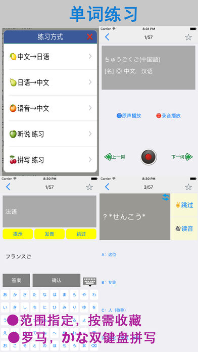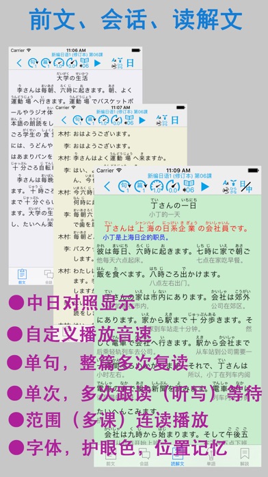 本APP参照《新编日语(修改本) 第一册》制作而成。包含了1〜20课的前文,会话,读解文,单词和语法等5大部分。全部的课文和生词都配有真人的发声。您可以通过手机和平板进行下载。方便任何有需要的朋友方便快捷的学习,能够快速强化您的听,说,读,写能力。本APP集成了超强的复读功能,可以根据自己的需要对每个单词、每句话或者整篇内容进行一遍或多遍的复读,洗脑式的复读可以加强记忆。同时,您还可以在“设置”里进行设置后台播放,方便您在移动中使用。 (注:如果您有任何购买问题咨询或意见反馈,可通过新浪微博:橙汁APP,或微信chengzhiapp 和我们取得联系) 语音复读模块: 在会话,课文和单词部分中,除了手工点击可以播放外,还集成了超强的复读功能。具体包括: ① 通过词[句]([词])按钮【左2】 调整 一句话/单词 的 单次复读次数(最大为99次)。 ② 在①的功能基础上,还可以通过[篇]按钮【左3】来调整整篇的复读次数(最大99次)。 在和①的功能组合使用的时候,一句话/一个词 最大可以复听(99x99)次。 ③ [音速]按钮【左4】用来调节发音的速度(0.5~2.0),帮助您找到适合自己的语速。逐渐的加强听力。 用来调节发音后的等待时间,(0.1~10),您可以在设置中设置适合自己的默认发声的速度。) ④ [等待]按钮【左5】置适合自己的默认发声的速度。)使用该功能可以方便您进行听写和跟随朗读。同时该功能也配合[句,词]功能进行多次跟读。 (您可以在设置中设置等待时间的单位(单词发音长度单位或时间秒单位)。) ⑤[范围]按钮【左6】用来调节复读的范围,通过该功能可以实现多课连续朗读。该功能可和上述①、②、③的功能同时使用,让您最大限度的使用复读功能。连课范围是:进入的课开始,选择的连课结束。例如:复读3-16课:第3课进入,选择16,点击播放即可。 ⑥ 如果在设置中打开后台播放功能(默认打开),就可以让您设置的复读声音进行后台播放。您可以通过耳机的线控进行停止/继续,在有在连课的时候,更能通过线控进行切课。(单击2次换下一课,单击3次换前一课,单击一次播放/暂停。) ⑦ 按钮 [▶]/[■]【左7】进入复读开始/停止。 课文,会话: ①为方便初学者,本APP为文章中的每个汉字加上了注音,您可以通过[ひらかな]按钮进行显示或隐藏的切换。 ② 显示切换:您根据自己的需求,通过工具栏上的[中/日/中日]的按钮进行中文或日文的显示/隐藏的切换。 单词部分: ① 显示切换:您根据自己的需求,通过工具栏上的[中/日/中日]的按钮进行中文或日文的显示/隐藏的切换。 ② 收藏模块:您可以通过每个单词右边的[星号]按钮,对单词进行收藏。并通过顶部的[星号]按钮,对收藏的单词进行过滤显示。 ③序号显示:可通序号显示按钮进行序号显示临时切换。 ④分列显示:更改屏幕的单词显示方式(上下显示,左右显示)。 ⑤乱序显示:更改屏幕单词的显示顺序。(支持复读) ⑥单词过滤:通过过滤按钮可以进行显示范围的调整。 ⑦练习模块:通过顶部的[练习]按钮,您可以切换到单词的练习模块。本APP集成了“中文->日文”、”日文->中文“、”中文->语音”,“听说比对” ,“单词拼写”等(以下)五个练习模块。(※ 1,※ 2,※ 3) a. “中文->日文”练习:根据中文内容选择相应的日文。 b. “日文->中文”练习:根据日文内容选择相应的中文。 c. “语音->中文”练习:根据听到的声音选择相应的中文。 d. “听说比对” 练习:通过录音,及回放比对您的发音和标准发音。 e. “单词拼写” 练习:通过提示的中文,通过键盘(kana或罗马字)拼写出假名。 ※1 练习模块可和收藏模块进行配合时,可对自己选定(收藏)的单词进行练习。 ※2 练习模块可和范围模块进行配合时,可对特定范围进行练习(例如:第一课进去,选择连课16课的时候,练习范围就是1-16课的单词)。 ※3 练习模块可同时配合收藏,连课2个模块一起使用。 语法解释: 收纳了课本中的语法解释部分的所有语法及例句。 五十音图: 包含了日文字母,清音,浊音,拗音的平假名 ,片假名,罗马字及其相对性的发音。 其他: ◎你可以通过左右滑动进行切换课(向左滑动上一课,向右滑动 下一课) ◎在设置中您可以设定使用后台播放(默认) ◎在设置中您可以设定默认的语音速度 ◎在设置中您可以设定后台播放时定时关闭的时间 ◎在文法界面,右上角有一键打开全部文法的按钮 本APP采用iphone,ipad的双版本设计,一次购买,可在iphone,ipad上同时使用。 APP 中的大量内容,是作者手工录入的,如果您发现不对的地方,望在APP里的意见反馈中联系我们,我们会在定期的版本更新中,修正您提出的问题。谢谢。 如果您喜欢这款app,请赠予评价,将是对我最大的鼓励,您的好评会让我更有动力将这款app做到最简洁,最方便,最实用!! 注1:本APP不含有内购和广告。 注2:本APP不是电子版的教科书,是一款配合教科书的学习用的APP,我们侧重了学习语言最重要的2个部分-听力及其单词记忆,为此我们开发了这款带有超强复读的APP,并对单词部分提供多种练习。 注3:如需想对APP进行功能试用,请下载,新编日语体验APP。