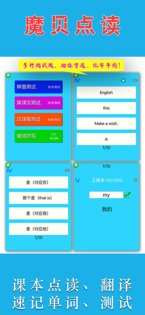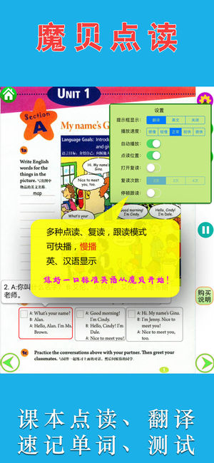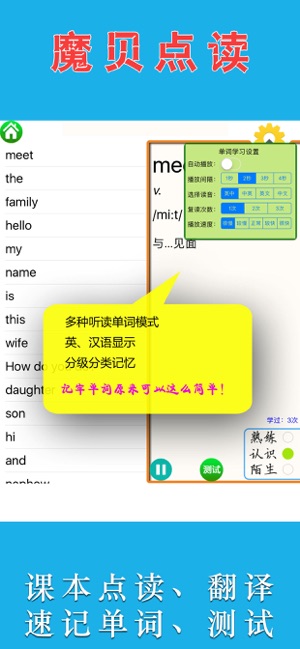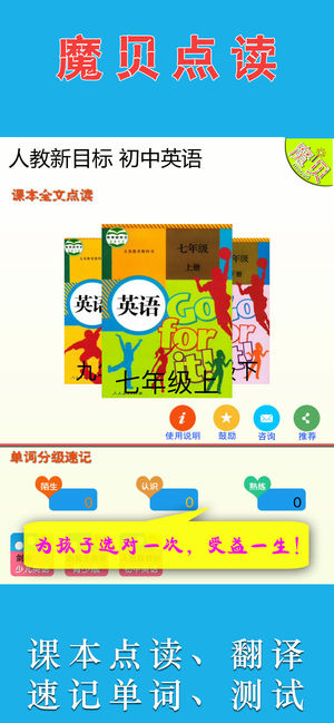注意: 《魔贝点读学习机 - 初中英语(人教新目标版)》是全网内容最全的《人教新目标初中英语》点读学习机,包含了七年级、八年级、九年级。 这一次,你为孩子做了正确的选择——魔贝点读学习机。 选英语点读软件,从以下几个方面判断:录音质量、点读长度设置、播放功能科学性、译文的准确性、单词速记的有效性。 《魔贝点读学习机 - 初中英语(人教新目标版)》 ■清晰的原声外籍人士录音。(没有咝咝的背景电流噪音) ■史上最细、最贴心的教材点读长度设置。尽可能分词、分句、分人物对话作为点读单位,方便跟读。 ■播放功能科学,可以随意播放课文中的单词、句子等。可设置多种播放复读模式。可以慢播、快播。 ■英语…