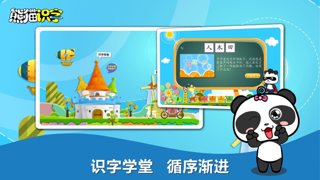 全国400客服热线:400-884-2525 《熊猫识字》软件从宝宝兴趣入手,寓教于乐,在看动画故事、玩识字游戏过程中快乐高效的完成学习,同时潜移默化的让宝宝养成良好的性格、习惯。 【产品特色】 专为3-10岁儿童设计的互动识字学习课程 由教育专家与互联网新酷团队精心设计 知名儿童文学专家与汉语教育研究者共同推荐 识字学习和素质教育故事结合,轻松有趣 采取智能学习策略,让学习更高效 课程内容在使用期限内免费更新升级 一个学习帐号,适用于PC、PAD、手机、电视 帐号不绑定特定终端,随时随处可以上网学习 【识字课程内容】 识字学堂:2000多个常用汉字;9000多个配套词组; 故事学堂:2…
