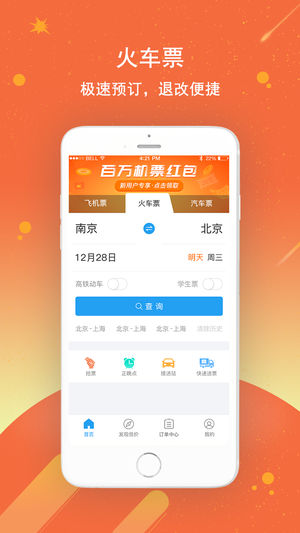 【国内机票】国内机票,底价优惠袭来,往返立减20; 【国际机票】全球国际飞机票,千余条航线等您来选; 【在线支付】支持微信、支付宝、银联信用卡支付方便快捷; 【火车票】火车票订票,抢票,支持12306网站购票; 【汽车票】支持全国联网汽车票订票,网上订票车站自取; 【特惠酒店】全国精选机场火车站附近特惠酒店等你来订;