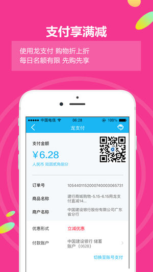 建行善融商城是中国建设银行为iPhone用户推出的一款移动购物类应用,具有浏览及搜索商品、加入购物车、下单、支付、查询物流、确认收货、管理订单等功能,实现全流程购物操作,为您打造简单便捷的购物体验。 产品特色: 1、 登录便捷,支持建行手机银行、个人网银及持有建行账户的客户免注册登录。 2、 支付方式多样智能,提供商城账户余额支付、快捷支付、建行账号支付、建行手机银行支付以及组合支付、信用卡分期等多种支付方式。 3、 摇一摇特色功能新颖有趣,可通过摇动手机查看善融的推荐商品及特惠商品。