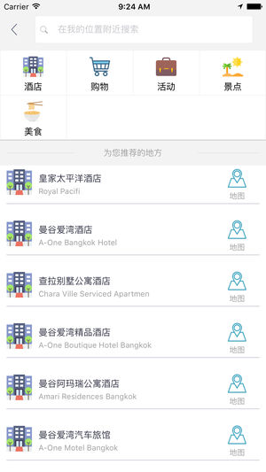 曼谷中文离线地图是一款支持中文地名和酒店标注的地图。所有数据全部打包在应用中,在离线环境在完全可用,是去曼谷旅游的必备工具。 主要特征包括: 1 地图数据完全离线 2 酒店全部中文标注,并提供酒店详细描述 3 部分重要地点中文标注 4 支持酒店查询,快速在地图上定位 5 支持景点、购物、美食、活动等信息在地图上的展示,并提供列表视图快速浏览 6 支持附近酒店、景点、购物、美食、活动的查询 7 支持离线路径规划