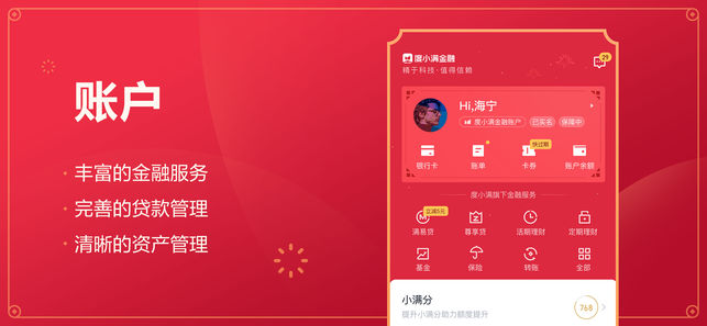 度小满金融(原百度钱包)旨在成为领先的金融服务平台。度小满金融(原百度钱包)提供面向大众的方便、快捷、安心的互联网消费信贷服务;提供优质的理财服务,包括活期理财、定期理财、银行理财等多元化理财产品。度小满金融(原百度钱包)帮用户安心实现财富增长,同时融合多种便捷生活服务。 特色功能如下: 【有钱花】 “有钱花” 利用人工智能和大数据风控技术,是面向大众的互联网信贷贷款服务平台,为用户提供方便、快捷、安心的借款服务。“有钱花”仅需您填写身份信息,提交材料后最快30秒即可获得借款额度,最高额度200,000元(以最终审批结果为准),日息0.02%起,借钱就找“有钱花”,随时借款。…