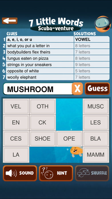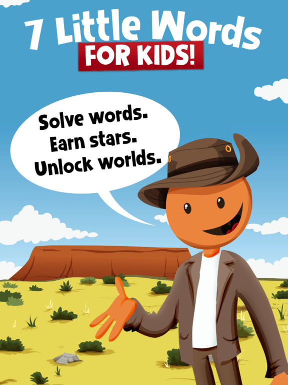 * 2013 Children's Technology Review - Editor's Choice Award for Excellence in Design * Well done. You've found the version of 7 Little Words that's made just for kids! Discover 7 colorful worlds as you solve the mini word puzzles. But don't worry if you get stuck. You can always get a hint if you need it. It's made just for kids, but many parents will love it too. 7 Little Words for Kids features: * KID SAFE! No ads and no in-app purchases * 350 EASY words and clues * Randomly generated puzzles for infinite replay * Earn stars to unlock each world * Cool statistics Discover 7 colorful worlds: * Scuba-venture * On Safari * The Museum * Down Under * Frozen Fun * Spacewalk * Dino-World Over 6,000,000 people have downloaded the grown-up version of 7 Little Words, which was recognized in O, The Oprah Magazine and which received an Honorable Mention for Best Educational Game in the 2011 Best App Ever Awards. From the creators of Moxie. Retina and iPad ready.