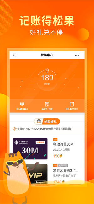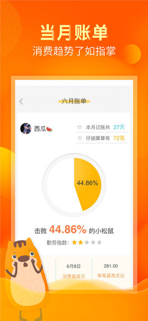 松鼠记账—3秒随手记账,千万用户的记账管家! -业内公认的超简洁记账风格,致力完善清新快捷的交互体验 -数学不好算不清复杂的账目结果?松鼠支持自动精算,多种分类账单数据具象化展示,距离完成土豪小目标只差1个松鼠记账。 【产品功能】 1)3秒快速记账:极简的记账工具,只需3秒,完成记账。 2)数据同步:登录注册账号后,随时随地云储存往期数据,换手机也不怕丢账单。 3)制约剁手:设置当月预算,月光不再怕,小松鼠随时提醒剩余花销。 4)收支构成:自定义查账时间周期,可按多种分类方式了解个人花销占比。注册绑定邮箱后,还会月月收到私人定制的深度账单分析,帮你合理管理钱的去向。 5)多账本记录:日常账、…