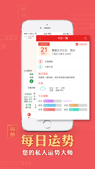 限时限免!顺历老黄历无广告纯净版!免费下载! 老黄历专业版,比普通版更精美的设计,各种节日背景图,详细节日介绍,给你最贴心的体验! 老黄历,炎黄子孙一直在用黄历来作为生活指导手册,作为择取婚嫁,出行,入宅,上任等一切重要日子的必备参考。 主要功能: 1、节日提醒:港澳台等地区节日提醒,道历佛历应有尽有! 2、择日查询:择日旅游出行、婚娶、入宅。爸妈咱们自己选日子。 3、天气提示:提供一周天气预告,穿衣建议。让你出门既有温度又有风度。 4、时辰吉凶:选吉时你也可以做到!掏出手机一秒变大师! 5、每日宜忌:关注黄道吉日,好日子做该做的事,事事顺利! 6、记事提醒:搭配独家每日宜忌的记事功能,轻松安排日程。 7、财神罗盘:专业财神方位指示,打牌打麻将必备! 8、更多功能:等你来给建议。