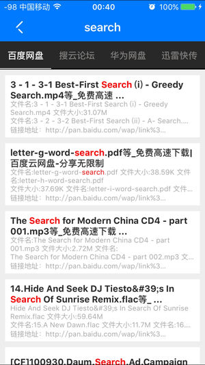 取消搜索次数限制!!! 添加多个搜索源!! 还在为找网络资源而烦恼吗? 还在为各大网盘没有全盘搜索功能而抱怨吗? 网盘搜索神器!解放你的左右手! 能搜索国内十几个网盘的分享资源! 功能强大,界面简洁,还在等什么,快快来下载吧!
