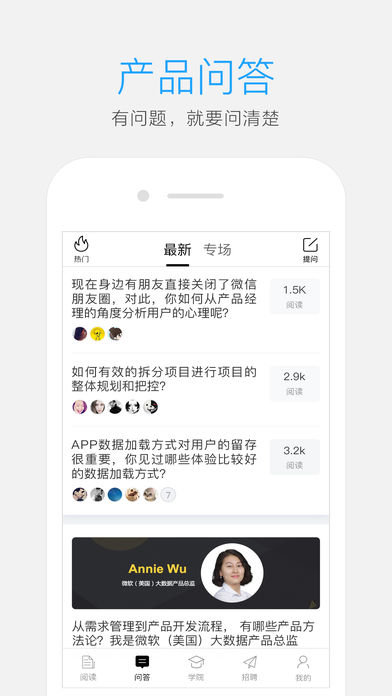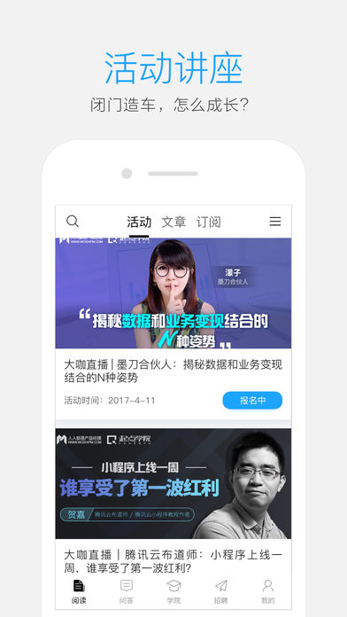 人人都是产品经理(www.woshipm.com),中国最大最活跃的产品经理学习、交流、分享社区,集媒体、社区、招聘、教育、社群活动为一体,全方位服务产品经理。 内容:内容最全、更新最快、100+专业内容运营团队,1000+专栏作家队伍,包括:傅盛、周鸿祎、Blues、张亮、魏家东、韩叙、韩利、马力、刘飞、类类、纯银、快刀青衣、李叫兽、苏杰、李少加等,为你定制专属内容; 媒体:互联网各大媒体平台均已入驻,包括网易uedc、腾讯TGideas、百度uxc、58ucd、36大数据、亿欧网、速途网、创业邦、动点科技、雷锋网、饿了么ued、友盟、爱范儿、站长之家等平台; 活动:每月10期产品经理线下主题沙龙,覆盖北上深广杭等10余个城市,帮你扩充人脉圈子; 免费课程:每月4期起点学院公开课在线直播课程,邀请BAT一线互联网大咖,围绕产品、运营、交互、数据领域,帮你扩充知识,打开眼界; 培训:起点学院(www.qidianla.com)特邀腾讯、阿里、百度、新美大、京东、小米等一线产品总监手把手带你,为你提供专业系统的产品经理、运营、交互设计课程,让你的成长加速; 大会:每年均有在北京、上海、深圳、广州等城市举办产品经理大会、运营大会,是行业唯一千人产品经理大会缔造者; 书籍:专栏作家已推出《从零开始做运营》、《产品前线》、《交互设计那点事》、《互联网运营手册》、《 从电子到产品》、《产品经理必懂的技术那点事儿》、《绝密原型档案》等20余本书; 总之,人人都是产品经理就是一个以产品经理为主的互联网学习社群,每天有数百万互联网精英,在这里学产品、学运营、交朋友、享受成长的快乐。