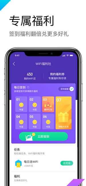腾讯荣誉出品的一款安全WiFi连接app! 秒连亿万优质热点,餐饮、娱乐、候机轻松连 风险防御、测速、防蹭网一站式体验 ------轻松连上好WiFi------ 【亿万WiFi】 合作亿万认证WiFi,一次认证天天轻松上网。 【地铁WiFi】 花生地铁WiFi联手合作,上海、广州、深圳、昆明、青岛、武汉六大城市一键连,看片不间断,开黑不掉线! 【WiFi安全】 实时监测手机WiFi安全、主动防御风险WiFi,推送可靠安全WiFi,钓鱼网、虚假WiFi通通不用怕! 【网络管理】 深度测速,精准判断当前网络延迟情况,给你平滑流畅的游戏、视频、文件传输体验! 【游戏加速】 腾讯游戏专属加速,告…