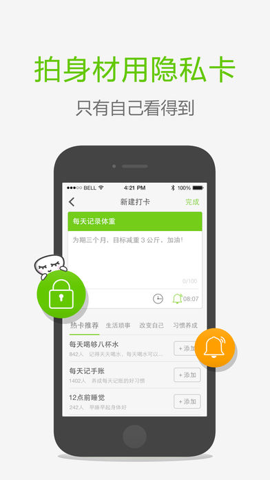 每天坚持一小步,改变,从每日打卡开始。 别跟小编说“臣妾做不到”,只是你还没开始打卡。 有近千人#今天去屎了#,小编我也是醉了!熏醉的。 有743人#想你一次就打卡#,那些情话写的,小编我感动的不行不行的。其实我也单身:( 别跟小编说“臣妾做不到”,你只是还没开始用打卡7。 坚持一件事,需要每天记录并提醒。 坚持一件事,也需要有人鼓励并鉴证。 坚持一件事,用【打卡7】。 打卡7,提供完善的记录功能,帮你记录每天坚持的事情,不让你遗漏 打卡7,提供趣味的成长勋章,让坚持不再乏味。 打卡7,会把坚持相关事情的人聚合在一起,帮你找“伴儿” 跟我说三遍: 马上打卡,开始做新的自己。 马上打卡,开始做新的自己。 马上打卡,开始做新的自己。