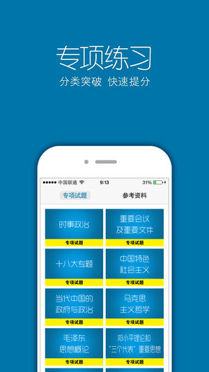 真题解析——历年各省市真题解析,押题几率高 专项练习——全面覆盖事业单位考试考点,分类专项突破 参考学习--不用买书,覆盖所有知识点 超大题量——各类事业单位试题满足考生练习及测试的需求; 离线使用--无广告,无需网络,方便便捷。 事业单位考试又称事业编制考试.公共基础专项训练包括:时事政治、十八大专题、马克思主义哲学原理、毛泽东思想概论、邓小平理论和三个代表、重要会议以及重要文件,中国特色社会主义理论体系、当代中国政府与政治、中共党史、法律基础知识、法理学与宪法、行政法、民法、刑法、公务员法、商法、经济法、经济知识、政治经济学、科技常识、人文历史常识、事业单位知识、社会公德与职业…