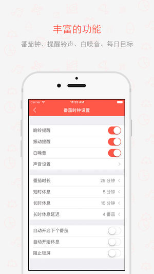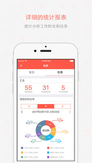 番茄任务,番茄工作法结合任务管理,为专注工作和学习而设计,告别拖延症! 主要功能: - 番茄工作法: 支持番茄的开始,休息,停止操作 支持番茄时间,长/短时休息的时间自定义,长时休息的间隔自定义 支持自定义是否自动开始下个番茄 - 任务: 支持任务安排 支持项目管理 支持提醒,重复和截止日期功能 支持任务预计番茄数设置 统计项目的进度、剩余任务和工作量 - 报表: 支持番茄使用时间和番茄数量统计 支持今天/近7天的番茄时间的分布甘特图的展示 支持日/周/月三个维度的执行番茄数的趋势图展示 支持完成任务数量统计 - 支持阻止锁屏