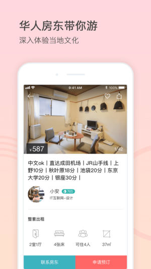 一家民宿 - 全球华人民宿预订平台 在樱花季,去日本住当地华人民宿,房东除了接送机还带我去了赏樱的好去处。 在逢甲夜市,贪吃的我胃不舒服,热心的华人房东又送胃药又倒开水,感动。 在韩国东大门,华人房东带我买了好多质优价廉的服装。 …… 千里之行,有了一家民宿,从此天涯若比邻。 - 覆盖全球30多个国家200多个地区的民宿可供选择; - 华人房东全中文接待,无语言障碍,沟通更便捷; - 性价比更高,比酒店便宜30%-50%; - 精通中文的房东还能带你体验不一样的当地文化; - 支持支付宝交易,人民币结算 只会中文, 来一场说走就走的旅行, 从安装一家民宿开始。
