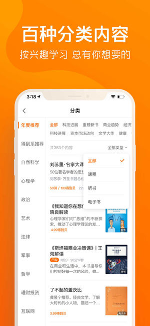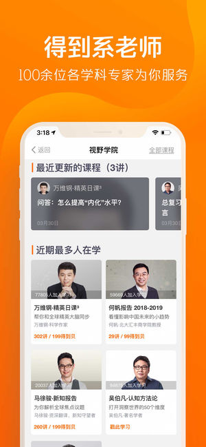 得到是一款可以听音频、学通识课程、看电子书、看直播、看知识短视频、记笔记的软件,致力于服务所有终身学习者。 晨起、睡前、锻炼、通勤路上,一个人、陪家人、带孩子,都可以和「得到」一起度过。 每天半小时,你可以得到精心打磨的严肃知识和书籍内容。 【130门独家专栏课程】 罗振宇、薛兆丰、梁宁、香帅、万维钢、刘润、宁向东、武志红、施展、王烁、吴军、李翔等100位各领域的专家学者和知识高手,为你打造独家精品内容:经济学、管理学、商学、医学、金融学、心理学等帮你完善通识教育,文学、艺术、历史、科学思维、儿童教育等助你全面提升自我素养,产品思维、前沿视野、人工智能、互联网科技、硅谷哨探为你提供最顶级的视…