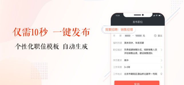 ● 怕招不到人?你能想到的所有职业,都可以在招才猫的简历库里找到 ● 怕招人太麻烦?全职位模板供你选择,同求职者在线视频、直接面试,最快当天入职! ● 怕留不住人?打开招才猫学院学习各种行业干货、人力管理方法 ● 特色功能 【10秒快速发布】销售、厨师、客服、司机、服务员······职位描述不用手动写,全行业的个性化模板,选中职位发布,10秒就搞定~ 【招聘效果数据】实时查看职位、简历的相关数据,提供最专业的指导建议! 【简历推荐】根据当前发布职位,全智能推荐最优简历! 【在线沟通、实时邀约】同求职者在线视频,直接面试,最快当天入职~ ● 热门企业 海底捞火锅、中国平安、顺丰速运、同仁堂、…
