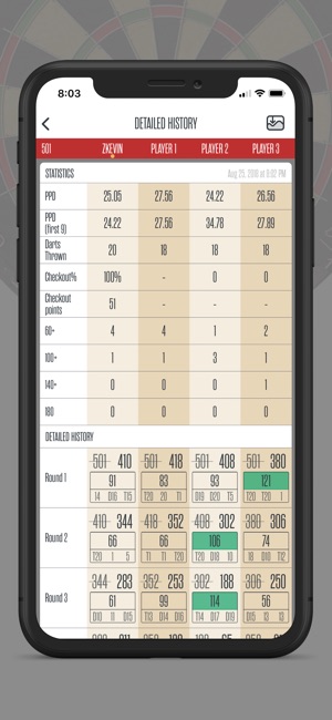 Dartsmind是为飞镖选手和爱好者设计的专业飞镖计分和统计工具。 已有超过‘600万’局飞镖比赛,通过Dartsmind完成。 请在instagram上关注我们: dartsmind 主要功能: - 支持大部分飞镖比赛,包括:X01, Cricket, Cut-Throat, Around the Clock, Bob's 27, Count-Up, 99 Darts, Gotcha, Bermuda, Shanghai等. - 支持和飞镖机器人对战。 - 自动计算和保存飞镖比赛的详细统计数据,和每局的详细历史记录。 - X01和Cricket比赛支持‘SET-LEG’模式设置。 - 大…