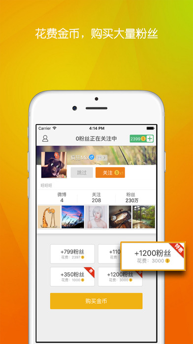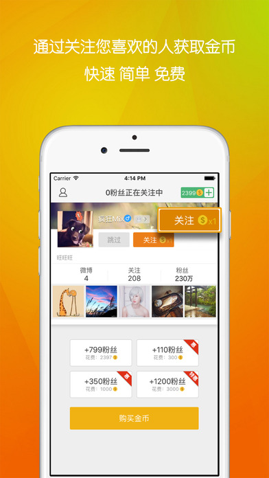 互粉大厅免费让您快速地获取大量活跃,真实的新浪微博粉丝!如果您想获得大量粉丝,我们将您的信息推送给成千上万的用户并关注您。 互粉大厅,轻松帮您加粉丝!微博活跃度低,不好玩?求转发!求粉丝!您是否粉丝太少,没有激情?没人转发,没有动力?来这关注有趣的人,结识好友,提高互动,提高微博知名度! 如何获取粉丝? 步骤1:关注您喜欢的用户获得金币,或者购买金币 步骤2:购买您想要获取的粉丝数量(买多赠多哦~) 步骤3:静静的等待您的粉丝到您的碗里