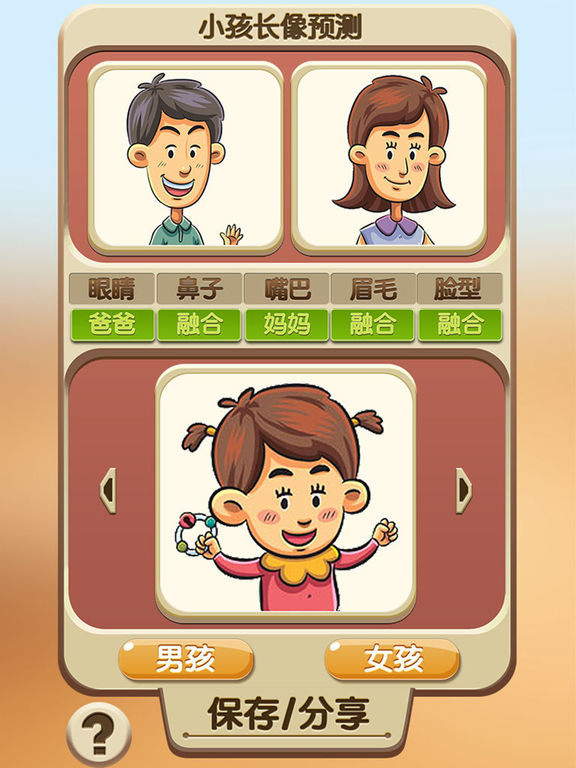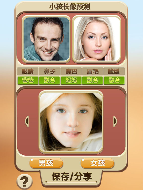 有没有想过你们未来的宝宝长相是啥样?小孩长相预测可以完全满足你的要求。 你可以自由定制设计,是男孩还是女孩,甚至于他们的眼睛,鼻子,嘴巴等五官像谁,当这一切都设计好后,应用就可以快速的生成一张宝宝照片。 怎么用: - 选择父母的照片(你和你丈夫/妻子的照片) - 调整照片到合适的大小(正面照片,头部) - 随机生成,或者自由定制(性别,五官等) - 点击开始预测 - 保存照片和分享 主要特色: - 简单易用 - 自由定制性别和五官 - 快速生成,只需要几秒就可以知道未来 - 易于分享