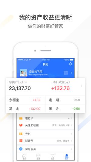 蚂蚁聚宝App全新升级为蚂蚁财富App,用户使用一个账号,即可在蚂蚁财富平台上进行余额宝、存金宝、基金等各类理财投资,同时还可获得财经资讯、市场行情、社区交流等服务。你的金融生活从此开始,为你人生更自由。 1、 首页 ● 余额宝、定期、基金、黄金,品类齐全,灵活稳健; ● 最懂你的财富头条来了,与你相关的资讯都在这里; 2、 股票 ● 股票行情全新体验,聚焦股票自选,夜间模式更清晰; 3、 社区 ● 专注金融理财社区,有问题一呼百应,互动无缝隙; 4、 我的 ● 总资产类目展示更清晰,查看一目了然; ● 收入和支出自动分类目记录,账单查看更直观;