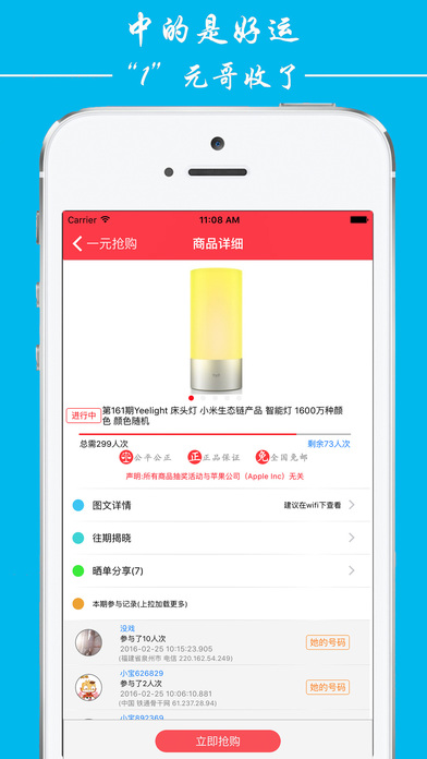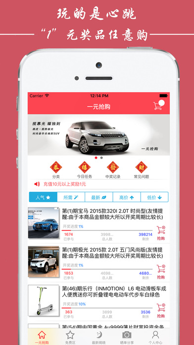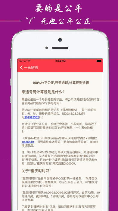 一元抢购,一种全新的购物体验,真的是只要1元,相信哥,没错的! 在一元抢购只需要1元即可参与丰富的活动,获得心仪商品。 【实现心愿,只要1元】 【100%公平公正 100%公开透明】 公平:每个用户都享有同样的权利和义务 公正:引入第三方数据圆,报关证分配结果随机性,保证绝对的公正 透明:计算公式和相关数据完全公开。 客服QQ:2257751658 1302836367 (特别声明:本应用所有活动与内容与苹果公司无关)
