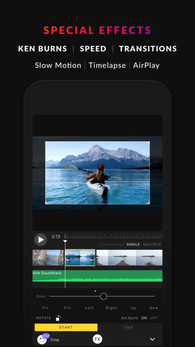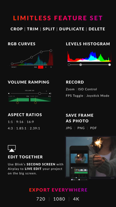 Blink is a real time video editor. Every adjustment, every filter, every tool works in real time. No loading screens, no render times, no waiting, ever. EDIT IN REAL TIME • All editing is performed live. Never sit through another loading screen • Record in 30,60,120, and 240 fps • Full screen previewing UNLIMITED UNDO & REDO • Every action is undoable IMPORT • Import from anywhere (videos, photos, music) • Supported apps include, but are not limited to: - Photos Library - Pixabay - a free community of over 1,000,000 photos and videos. - FreeSound - a free community of over 300,000 sounds. - iCloud Drive - iTunes - Dropbox - Box - Google Drive - One Drive CINEMA GRADE COLOR CONTROL • Adjust brightness, contrast, saturation, hue, vibrancy, highlights, shadows, exposure, and gamma • Levels tool with fully rendered histogram to assist in color balancing • Curves tool creates an RGB curve for fine-tuned color blending • Numerous filters to make your movies look like they were shot by famous directors AUDIO • Add music from your iTunes library • Volume ramping FRAME THE SHOT • Ken Burns • Trim, crop, and split videos • Duplicate assets • Change background colors • Multiple aspect ratios SPECIAL FX • Add transitions in-between frames • Slow and fast motion FX AIRPLAY • Custom second screen editing experience • Edit with a group using Airplay OPTIMIZED • Uses Apple's latest libraries - Core Image and the Metal Framework • Lossless compression of videos in the background • Weismann score of 12.6 (PP) EXPORT • Share your film by exporting to every platform including Facebook, Instagram, Twitter, ... • Export up to 4K • Take a still shot of your video and export any frame as a png, jpg, or pdf up to 4K quality ASPECT RATIOS • Square 1:1 • Portrait 9:16 • Standard Def 4:3 • HD TV 16:9 • Widescreen Cinema 1.85:1 • Anamorphic Cinema 2.39:1 Designed exclusively for iOS, Blink compiles the most powerful suite of editing tools available on the App Store. Everything from adding music, trimming, cropping, speed adjustments, filters, transitions, and numerous other features are all just taps away. What’s more, is that Blink allows you to make all of these edits to your video live. Iterate faster on your ideas and make adjustments on the fly. Blink is optimized to take full advantage of your phone's hardware for an optimal experience. Happy editing.