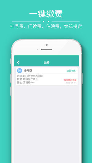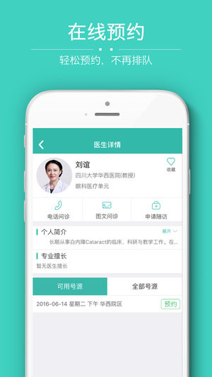 “华医通”是由四川大学华西医院官方发布的一款便捷就医APP。“华医通”以高效提升医疗质量为宗旨,集诊前咨询、诊中就医、诊间支付、诊后随访等为一体,通过医患实时交互实现便捷、高效的医疗全流程服务,为广大用户节省就医时间,节约就医成本。 四川大学华西医院坚守“关怀、服务”之理念,遵循“厚德精业、求实创新”之院训,传承并弘扬着“家国情怀、平民情感、休休有容、革故鼎新”的文化,深刻思考、凝心聚智、精心谋划、科学考量、合理布局,绘制出一幅能顺应医改新局面、强化核心竞争力的发展航程图,“华医通”在此背景下应运而生。 “华医通”提供以下核心功能: 1、预约挂号:提供多种方式,让您轻松预约到医生号源…
