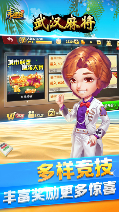 来游戏官方全新力作,引领棋牌手游新时代! =====游戏简介===== 武汉麻将-来游戏,采用武汉地区流行的麻将规则,特色玩法如:红中赖子杠、二五八、七皮四赖等。灵活的玩法配合来游戏的3D界面,欲罢不能。 =====游戏特色===== 【包房】新增特色包房,灵活创建房间,邀请好友竞技一决高下 【回放】边录像边玩牌,牌局回放功能让你在回顾牌局的时候还能炫耀牌技 【比赛】更多赛事活动搭配精美礼品,用惊喜回馈用户 【角色】结合手游经典RPG,带着你的MM上牌桌,享受暴击快感 【宝箱】多样钥匙开启多种宝箱,欢乐多多惊喜不断 ====联系我们==== 微信公众号:laiyouxi >>来游戏——Unity3D引擎打造的休闲竞技类游戏平台,给您身临其境的3D游戏体验<<
