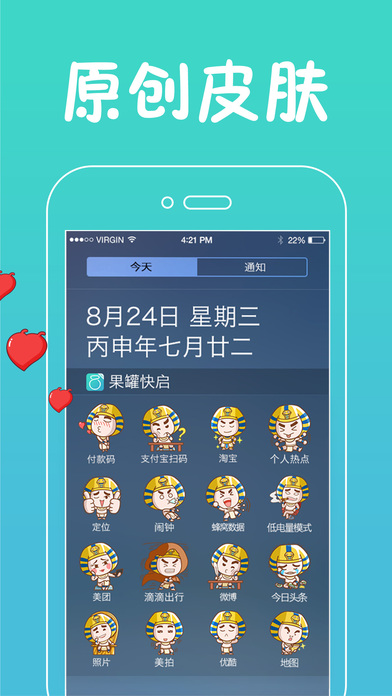 全新果罐3.0,2015年度最佳创意产品,受邀北京电视台BTV采访。 新ICON、新UI、新体验,致力打造全新便捷的理念却不曾变! 独家原创皮肤,这个秋天,晒出你的不一样! 在通知中心添加果罐,用快启和助手召唤神龙吧! ===果罐助手=== 实测网速:抢红包拼的是网速,不要老是怪“手慢无” 剩余电量:当前电量预估可用时长,不要动不动就玩儿“失踪” 磁盘空间:一目了然剩余空间,果罐,这个贴心的小管家,教你如何优化手机空间 ===果罐快启=== 快捷开关:蜂窝数据、低电量模式……… 一键支付:支付宝扫码、付款码……… 一键拨打:老爸、老妈、亲爱哒,快快接通我电话 再说一遍,原创个性皮肤,让小编心水的不能在心水了,这次是真的手慢无噢!!! 再说一遍,原创个性皮肤,让小编心水的不能在心水了,这次是真的手慢无噢!!! 再说一遍,原创个性皮肤,让小编心水的不能在心水了,这次是真的手慢无噢!!! 欢迎加入“果罐”:更多精彩模块,在这里等你“发现” 粉丝QQ群:432648637 官方网址:http://www.at321.com/gw/index.html 官方微信账号:guoguan-dy 官方微博:http://weibo.com/5698295280/profile?rightmod=1&wvr=6&mod=personnumber
