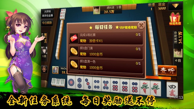 胡牌牌型: 1. 基本胡:1番(底金*1) 2. 碰碰胡:3番(底金*3) 3. 清一色:6番(底金*6) 4. 清一色碰碰胡:9番(底金*9) 5. 抢杠:相同于点炮,杠牌不成功 6. 杠上开:相同于自摸+杠 加番:如果胡牌时满足以下条件,则在胡牌牌型上额外增加以下番数 1. 门清自摸:胡牌时没有吃、明杠牌(+1番) 2. 明杠:手上有明杠(+1番/个)输赢都加 3. 暗杠:手上有暗杠(+2番/个)输赢都加 筒、条、万3门牌共108张,没有风。 换三张:起牌后,必须从手里的牌中选择三张花色相同的牌和别人进行交换。 出牌:首先从庄家开始出牌,可以碰和杠,不能吃。 胡牌:胡牌时必须满足缺一门…