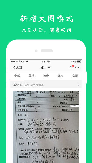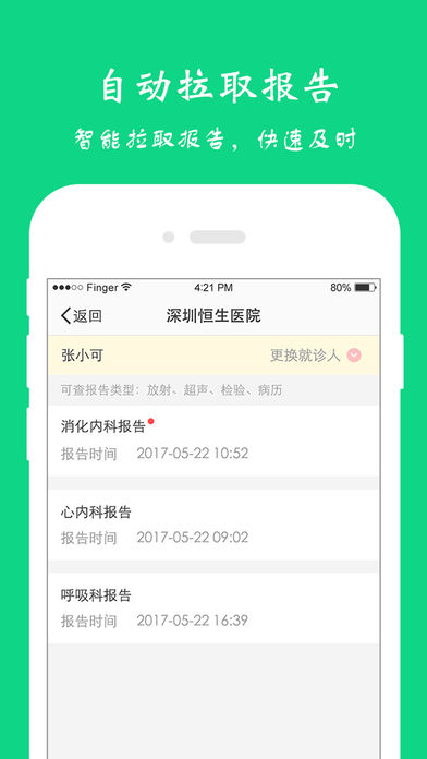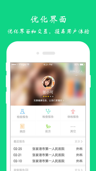 1、报告查询,查询检查检验报告,支持B超、CT、X光影像报告; 2、预约挂号,手机挂号,比别人快一步; 3、报告提醒,报告完成,及时获得短信提醒; 4、健康资讯,个性化推荐给你和家人健康资讯; 5、报告解读,及时掌握健康状况。 官方客服电话:4008557995 官方QQ群: 115732002 官方客服微信:yibanbingliben 官方微博:51健康档案 深圳依伴数字科技有限公司出品