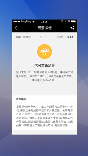 【产品描述】 91天气采用权威的数据源授权信息,覆盖全国四万多个城镇的天气预报。无论您身处大城市还是小乡镇,91天气都会给您带来准确的天气预报,为您的出行保驾护航。 【特色功能】 1、恶劣天气预警,提早做好防备。 2、24小时温度预报,多日天气预报,冷暖早知道。 3、软妹纸,萌汉纸为您播报每日天气。 有了91天气,妈妈再也不用担心我出门被雨淋啦啦啦。。。 还等什么,点击下载安装吧!!!